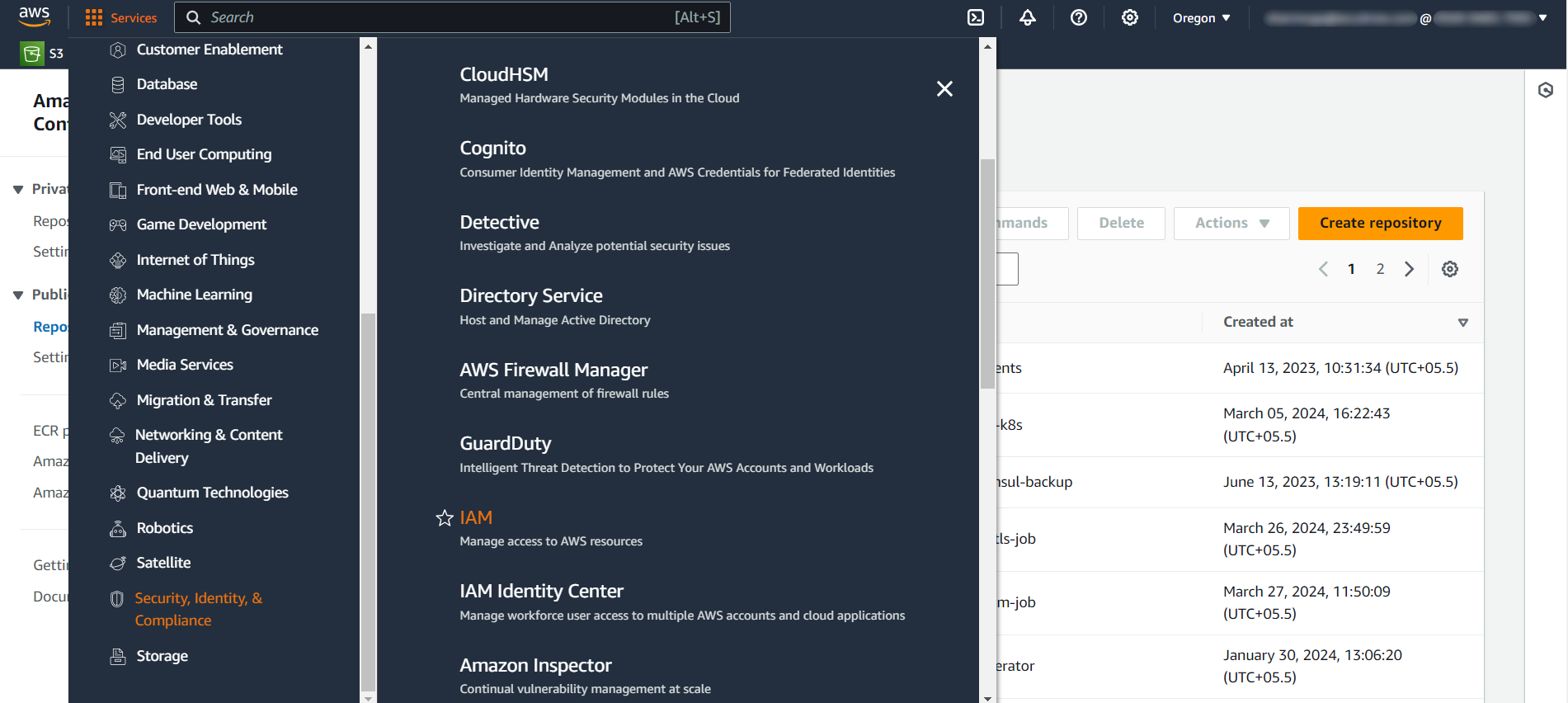 Step 2: Go to the IAM console by selecting Services in the top left corner, then under Security, Identity, & Compliance, click on IAM