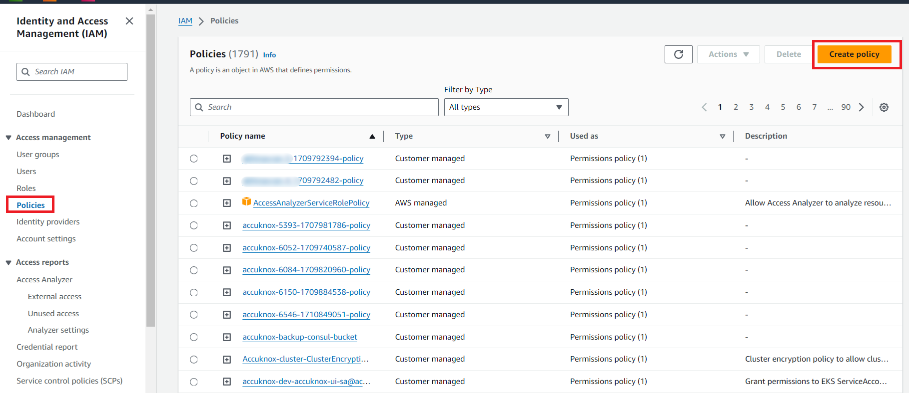 Step 3: Click on Policies in the left navigation pane to view the list of existing policies. Click the Create policy button.