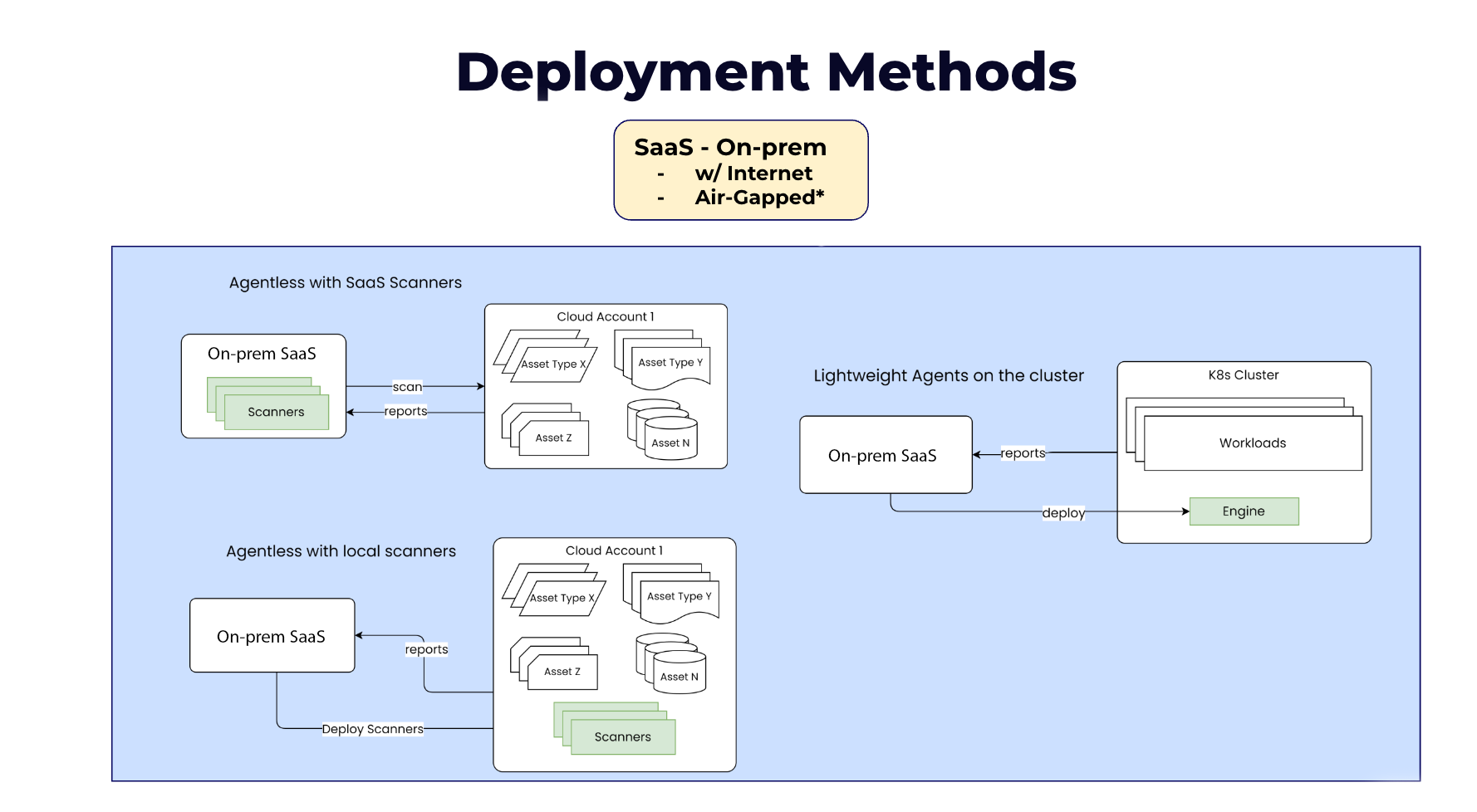 In on-premise deployment, AccuKnox SaaS Component will be deployed on-premise. With locally deployed SaaS component the Scans will take place and reports will be shown in the dashboard.